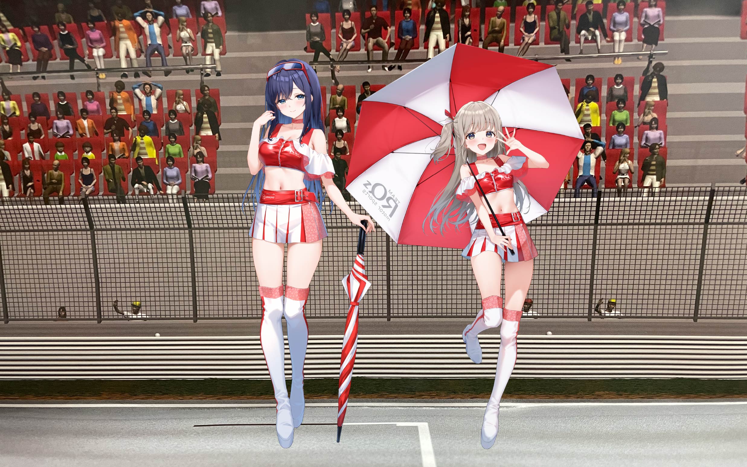 R’Qs Motor Sportsのレースアンバサダー衣装をまとった 篠宮セイラ と 星野ユイナ がサーキットを華やかに彩ります。